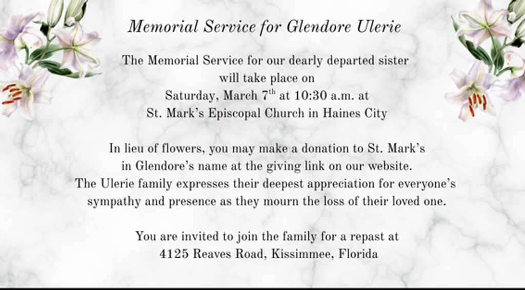 Click HERE to make a donation to St. Mark's in Glendore's name in lieu of flowers.